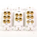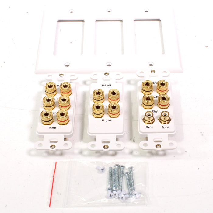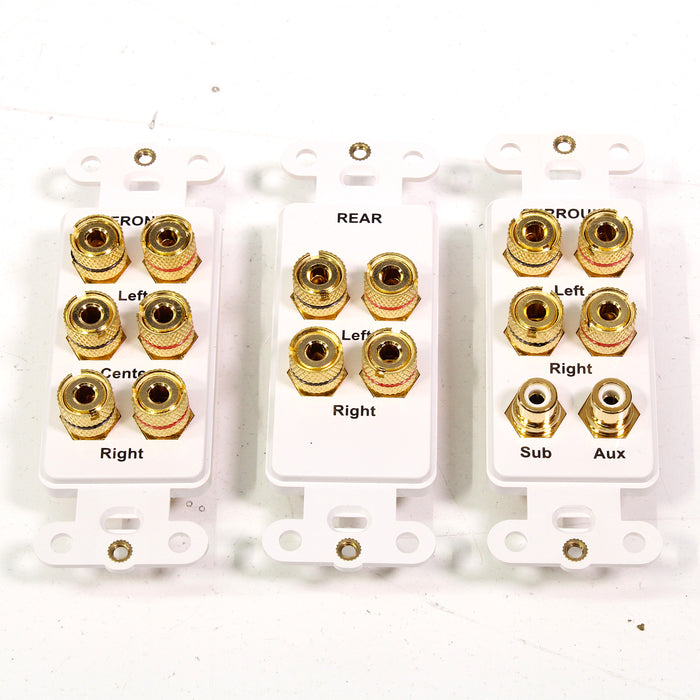 Complete your home theater installation with the Dayton Audio home theater wall plate! Audio connections for your speakers (binding posts accept up to 12 AWG wire) and two line-level devices (one subwoofer and one AUX or digital audio connection). Connections are plated in 24k gold to present a pure signal path while reducing performance robbing oxidation. The design utilizer Decora-style inserts and includes matching cover plates.